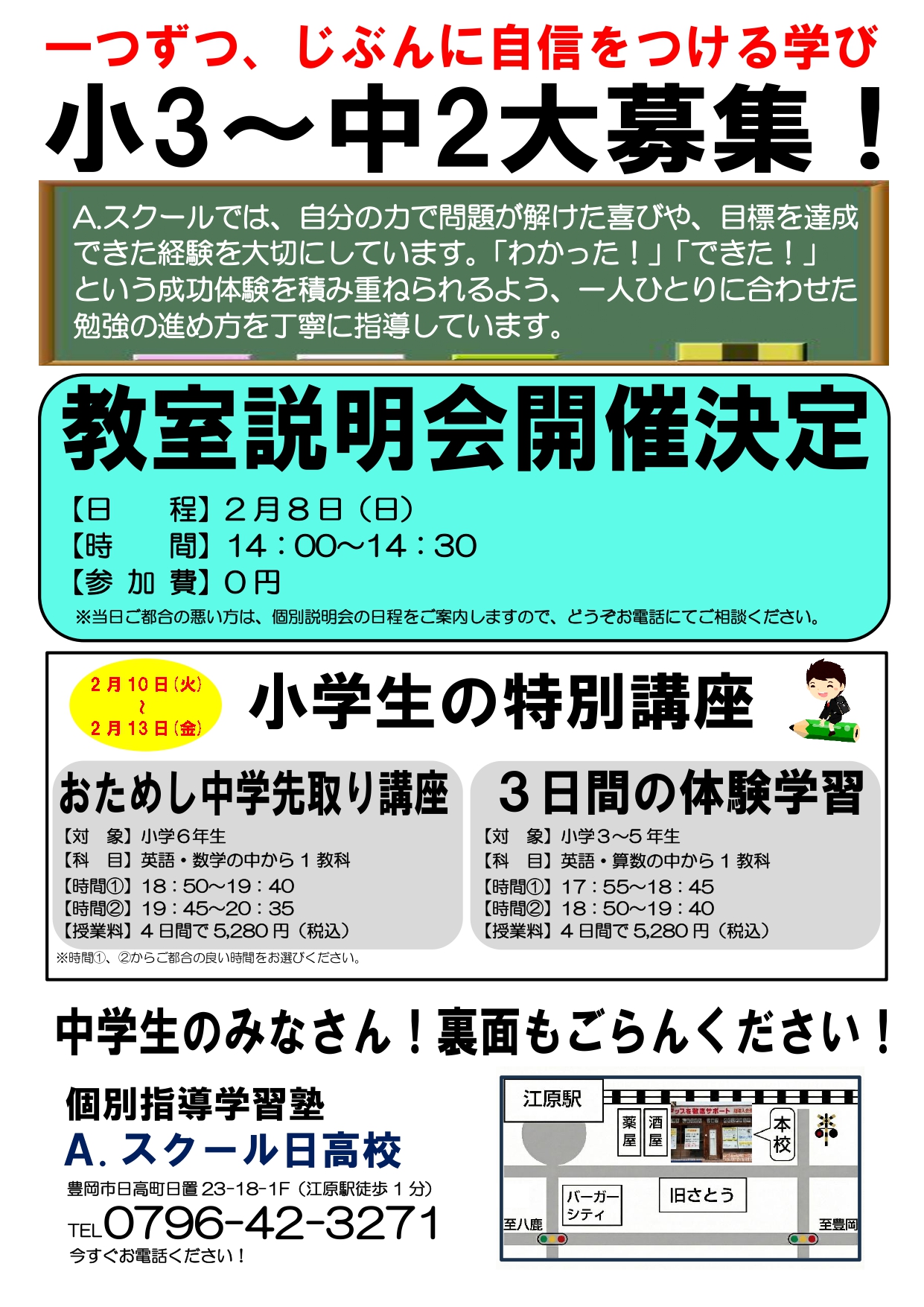 未分類 2月8日(日)説明会 開催決定! 未分類 2026.01.30 1月に開催し、大好評をいただいた説明会、2月も開催が決定いたしました!塾をお探しの方は、今すぐお電話ください!TEL:0796-42-3271